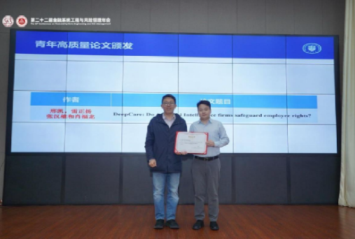 值得关注的是,《Deep Care: Do Artificial Intelligence Firms Safeguard Employee Rights》在200余篇报告论文中脱颖而出,荣获本届年会唯一“青年高质量论文”。中国系统工程学会金融系统工程专业委员会副主任、中国人民大学高昊宇教授颁奖,肖福龙代表团队领奖。