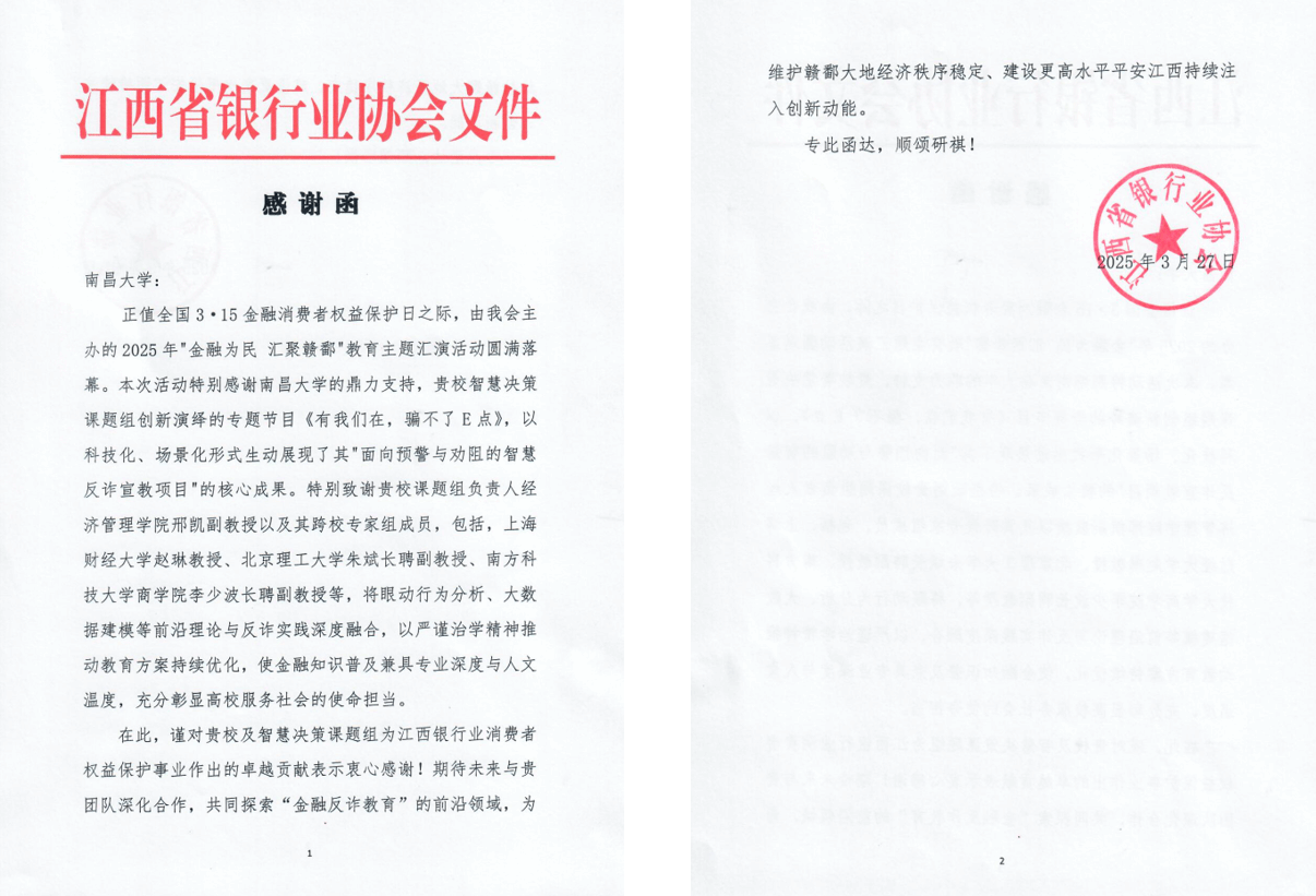 值得关注的是,此前在2025年3月,由该实验室前身“智慧决策课题组”延续发展而来的研究团队,已先后获得江西省证券期货业协会、江西省银行业协会的致谢。两封感谢信均高度肯定了课题组在金融反诈教育方面的创新实践与突出贡献,彰显了我院在服务地方金融安全、助力行业健康发展的社会担当。