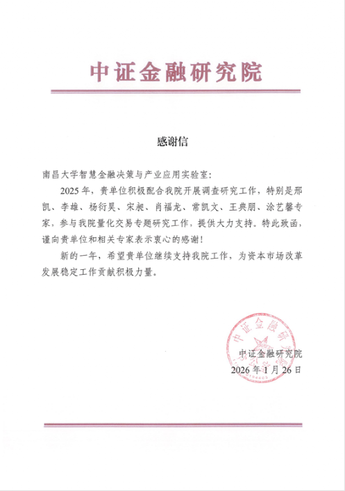 近日,我校智慧金融决策与产业应用实验室(以下简称“实验室”)收到来自中国证监会中证金融研究院的感谢信,对实验室在2025年量化交易专题研究中的支持表示衷心感谢。这是该实验室近期接连获得的又一项行业重要认可。