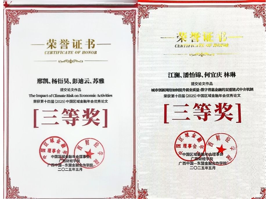 南昌大学经济管理学院彭迪云教授、何宜庆教授团队的两篇论文入选本届学年会分论坛:《The Impact of Climate Risk on Economic Activities》和《城市创新网络如何提升就业质量:数字普惠金融的双重链式中介机制》均进行会议宣讲。其中,上述论文均获评年会优秀论文“三等奖”。