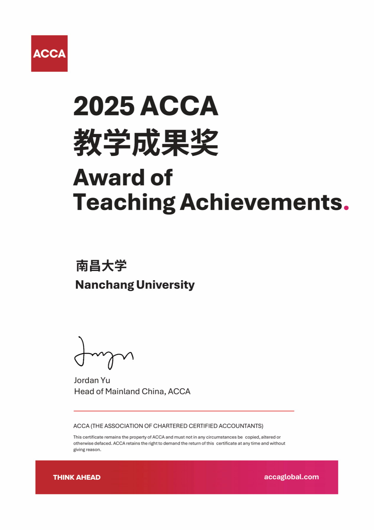 ACCA合作院校颁奖典礼也是本次论坛的重要环节之一,旨在表彰过去一年在ACCA教学合作中成绩斐然的高校。我校荣获ACCA“2025年度教学成果奖”,这是我校继2024年成为首批获得该奖项的国内高校之一后,再度蝉联该奖项。获此殊荣,既是对我校在国际化财会人才培养方面所取得成绩的肯定,也充分彰显了我校在ACCA专业教育领域的深厚积累与持续创新实力。