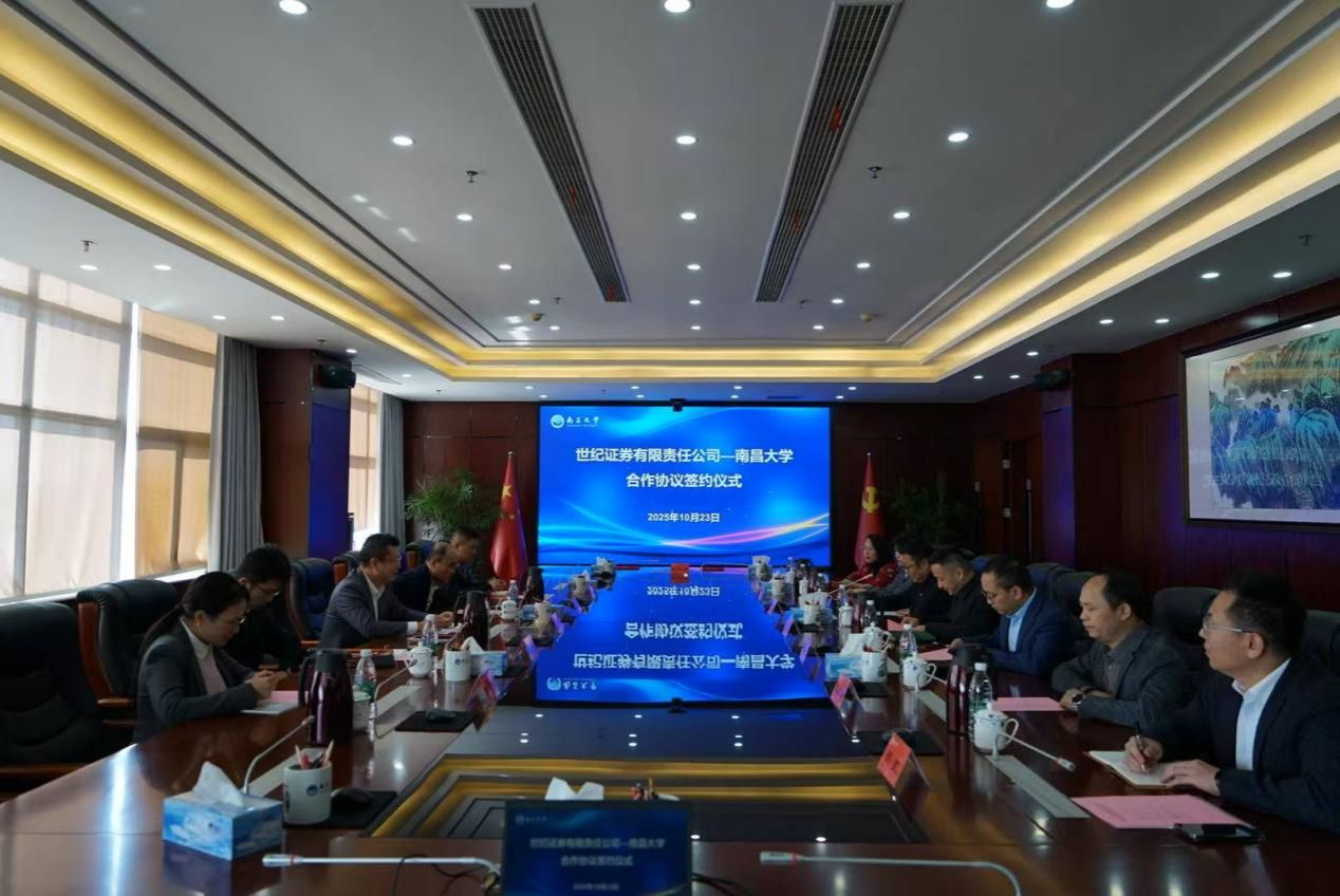 2025 年 10 月 23 日,南昌大学与世纪证券有限责任公司合作协议签约暨客座教授聘任仪式在南昌大学办公楼五楼多功能会议室举行。双方围绕产教融合、人才培养、科研创新等领域达成深度合作,共同开启校企协同发展新篇章。世纪证券有限责任公司党委书记、董事长李剑峰,财管委副主任、江西分公司总经理徐国保,财富平台中心副总经理任云鹏,南昌大学党委常委、副校长吴丹,部省合建与国内合作办公室主任田川,经济管理学院党委书记李飞强,经济管理学院副院长(主持工作)王玉帅等出席会议,会议由李飞强主持。