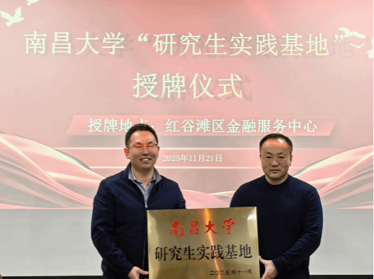 11月21日下午,南昌大学“研究生实践基地”授牌仪式在红谷滩区金融服务中心顺利举行,南昌大学经济管理学院金融系主任、智慧金融决策与产业应用实验室主任、江西产业金融发展研究院执行院长邢凯与红谷滩区金融服务中心党组副书记彭晓辉共同出席授牌仪式,见证校地产学融合再升级。