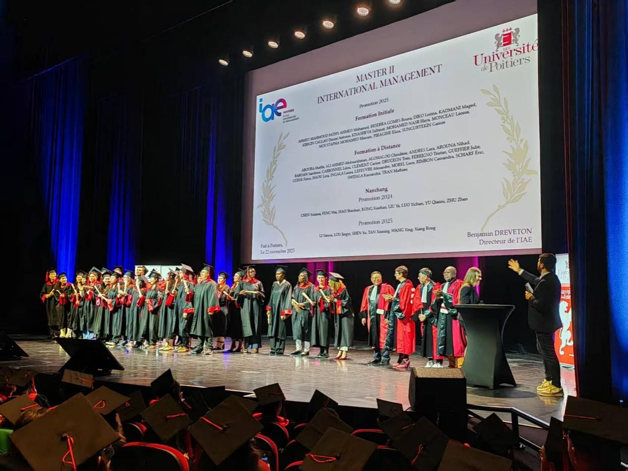 IAE学院的毕业典礼上,李飞强书记登台为我院中法国际企业管理2024、2025届硕士毕业生代表颁发毕业证,此次专程赴法国的毕业学生代表及其家属共计30人出席盛典。