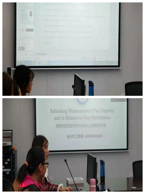 英国华威大学李雪纯同学,美国天普大学孙莹同学,南昌大学江思琪、陈雯、熊洪莉、徐阳同学先后以《Long-Term Impact of Economic Conditions on Auditors’ Judgment》《How does bank ownership affect firm investment?Evidence from China》《Rethinking Measurement of Pay Disparity and its Relation to Firm Performance》《Institutional investors’ corporate site visits and corporate innovation》《Opening Up the “Black Box” of Audit Firms: The Effects of Audit Partner Ownership on Audit Adjustments》《The consequences of shifting the IPO offer pricing power from securities regulators to market participants in weak institutional environments: Evidence from China》为主题进行汇报。会议期间,参会的国内外各高校同学就报告内容进行了积极交流,大家反响强烈,受益匪浅。