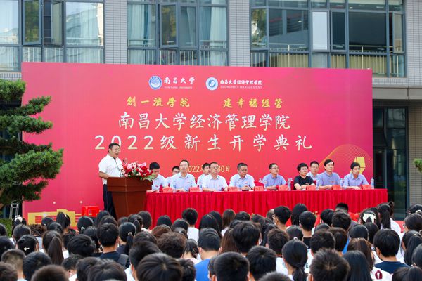 2022年9月30日上午8:00,时逢中华人民共和国73岁生日即将到来、党的二十大即将召开之际,经济管理学院在前湖校区智华经管楼门口,为2022级新生召开了一场“迟到却盛大”的开学典礼。出席本次典礼的有经济管理学院院长况学文,副院长兼中国中部经济社会发展研究中心常务副主任彭继增,副院长王军花,党委副书记吴金辉,中国中部经济社会发展研究中心副主任付智,副院长邵汉华、闫焕民,中法中心副主任沈强,系主任曾荣平、张横峰、李汝资、康丽群、邢凯,部分教师代表、家长代表、全体辅导员、团学组织学生干部、学长小教员及2022级新生。学院党委书记李飞强主持开学典礼。