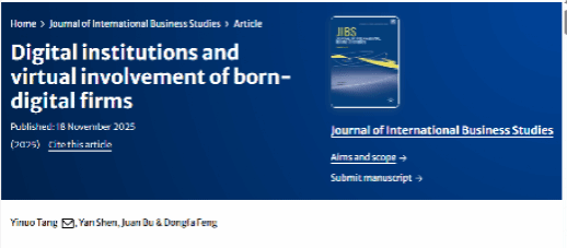 近日,我院冯冬发特聘研究员与北京大学汇丰商学院汤一诺助理教授、北京大学国家发展研究院沈艳教授、印第安纳大学凯利商学院卜娟长聘副教授的合作研究成果“Digital institutions and virtual involvement of born-digital firms”在国际顶级学术期刊《Journal of International Business Studies》线上正式发表。