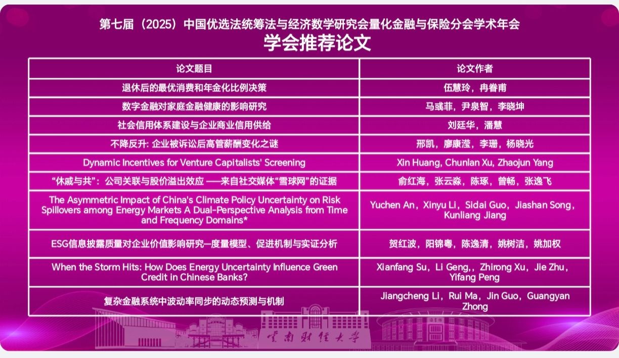近期,由中国优选法统筹法与经济数学研究会量化金融与保险分会、云南财经大学主办,云南财经大学金融学院、云南省巨灾风险管理研究中心承办,国家自然科学基金重点项目“数智技术驱动的投融资决策与风险管控研究”团队、广东省人文社科重点研究基地中山大学金融工程与风险管理研究中心、南方科技大学金融系协办的第七届(2025)中国优选法统筹法与经济数学研究会量化金融与保险分会学术年会在昆明举行。会议共报告论文近200篇,吸引了近500位来自境内外高校的师生及业界专家。南昌大学经济管理学院前湖金融研究会(简称“前金会”)指导教师邢凯副教授受邀参会。